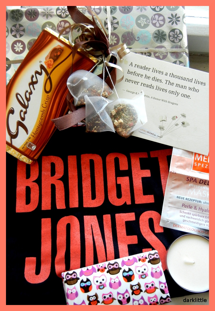 A few weeks ago, I received an awesome Bridget Jones Blogger Package from Random House UK and Lovelybooks. I’ve already told you how much I love their cooperations! The package included a signed hardcover copy of Helen Fielding’s Bridget Jones: Mad About The Boy (published by Jonathan Cape), tissues, Galaxy chocolate (that one was super yummy), tea (I love tea!), a scented candle, a facial mask and a Bridget Jones t-shirt! Now ain’t that great? The perfect equipment for a perfect weekend full of Bridget Jones. (We were supposed to read the book in a Lovelybooks reading group on one weekend) Well, thanks to our postal services it wasn’t really a weekend because the package arrived on Tuesday as far as I remember. Too late for the weekend. The chocolate was gone by then ;). Nevertheless, I’m still super happy about this lovely package. Thanks again. And here’s what I think about Fielding’s third installment in the Bridget Jones series.